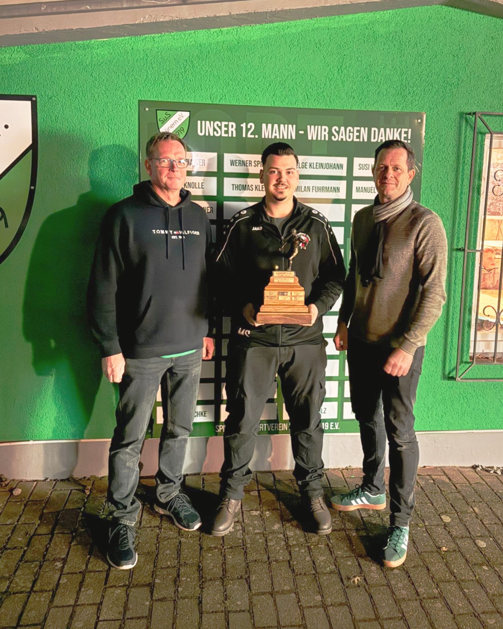 Stellvertretend nahm Trainer Max Schulz den Pokal aus den Händen von Jugendleiter Mathias Dördelmann und Jugend-Geschäftsführer Carsten Stöcker entgegen.